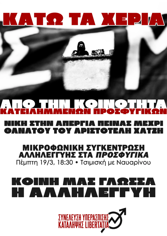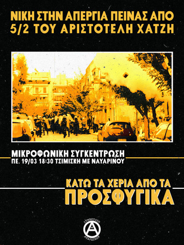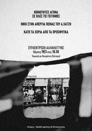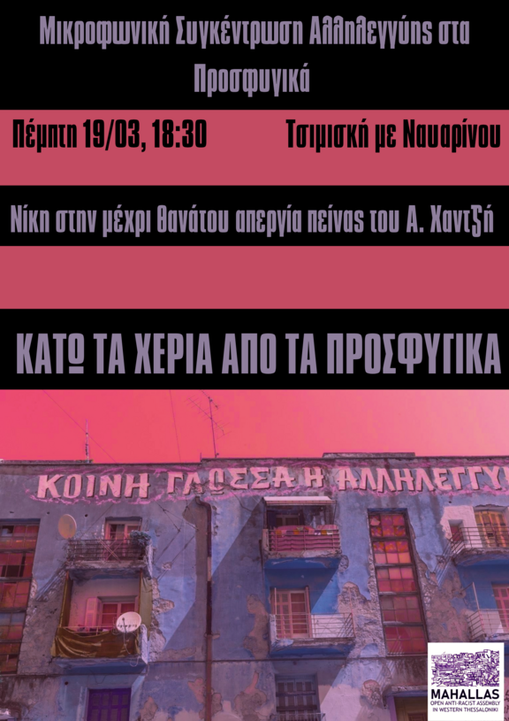 Στον απόηχο των κρατικών πιέσεων και εν μέσω απειλών εκκένωσης ο σύντροφος Αριστοτέλης Χαντζής, μέλος και κάτοικος της Κοινότητας Κατειλημμένων Προσφυγικών ξεκινάει (05/02) απεργίας πείνας μέχρι θανάτου για την υπεράσπιση ζωής. Μέσα σε αυτό το διάστημα, ξετυλίγεται ένα μαζικό κύμα αλληλεγγύης πανελλαδικά αλλά και παγκόσμια με την κοινωνία και τα κινήματα να αγκαλιάζουν τον αγώνα του απεργού πείνας και της Κοινότητας Κατειλημμένων Προσφυγικών ενάντια στα καταστροφικά σχέδια του καθεστώτος και των εταιρειών. Δεκάδες συλλογικότητες, οργανώσεις, φορείς, σωματεία και σύλλογοι έχουν οργανώσει προπαγανδιστικές δράσεις και παρεμβάσεις, έχουν υπογράψει δημόσια κείμενα και ψηφίσματα αλληλεγγύης. Ο πολύμορφος αγώνας συνεχίζεται και μας αφορά όλα.