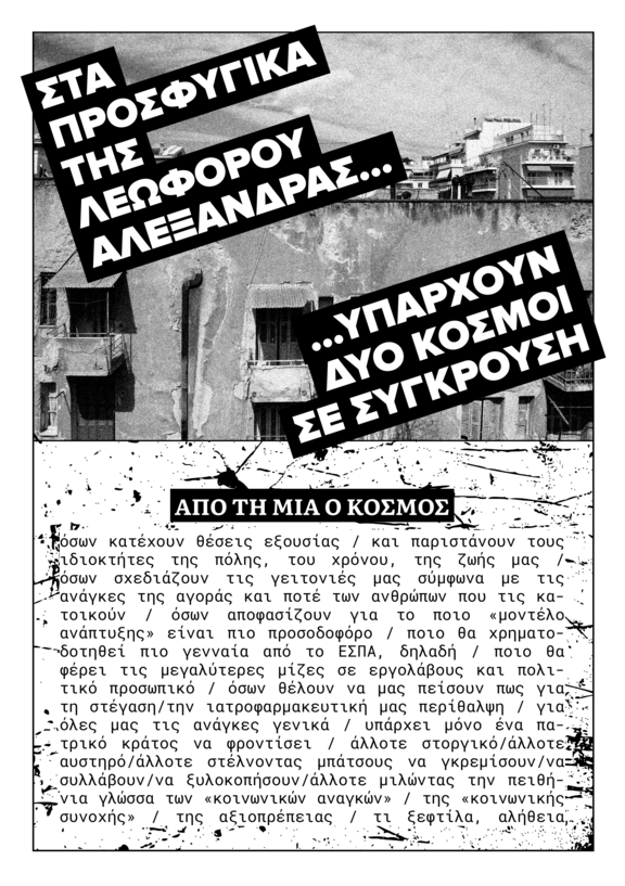 Από τη μία ο κόσμος όσων κατέχουν θέσεις εξουσίας / και παριστάνουν τους ιδιοκτήτες της πόλης, του χρόνου, της ζωής μας / όσων σχεδιάζουν τις γειτονιές μας σύμφωνα με τις ανάγκες της αγοράς και ποτέ των ανθρώπων που τις κατοικούν / όσων αποφασίζουν για το ποιο «μοντέλο ανάπτυξης» είναι πιο προσοδοφόρο / ποιο θα χρηματοδοτηθεί πιο γενναία από το ΕΣΠΑ, δηλαδή / ποιο θα φέρει τις μεγαλύτερες μίζες σε εργολάβους και πολιτικό προσωπικό / όσων θέλουν να μας πείσουν πως για τη στέγαση/την ιατροφαρμακευτική μας περίθαλψη / για όλες μας τις ανάγκες γενικά / υπάρχει μόνο ένα πατρικό κράτος να φροντίσει / άλλοτε στοργικό/άλλοτε αυστηρό/άλλοτε στέλνοντας μπάτσους να γκρεμίσουν/να συλλάβουν/να ξυλοκοπήσουν/άλλοτε μιλώντας την πειθήνια γλώσσα των «κοινωνικών αναγκών» / της «κοινωνικής συνοχής» / της αξιοπρέπειας / τι ξεφτίλα, αλήθεια