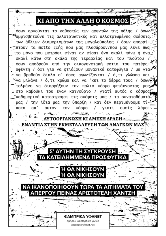 Κι από την άλλη ο κόσμος όσων αρνούνται το καθεστώς των αφεντάδων της πόλης / όσων αμφισβητούνε τις αλλοτριωτικές και αλλοτριωμένες σχέσεις των άθλιων διαμερισμάτων της μεγαλούπολης / όσων απορρίπτουν τα motto ζωής που μας πλασάρουν/που μας λένε πως το μόνο που μετράει είναι αν είσαι ένα σκαλί πάνω ή ένα σκαλί κάτω στη σκάλα της ιεραρχίας και του πλούτου / όσων αποδρούν από την οικογενειακή εστία του πατέρα-αφέντη / όχι για να φτιάξουν μοναχικά καταφύγια / μα για να βρεθούν δίπλα σ' όσες αγωνίζονται / ό,τι γλώσσα και να μιλάνε / ό,τι χρώμα και να 'χει το δέρμα τους / όσων τολμάνε να διαρρήξουν τον παλιό κόσμο φτιάχνοντας μες στο καβούκι του έναν καινούριο / γιατί αυτός ο κόσμος καθημερινά καταστρέφει τις σκέψεις μας / τα συναισθήματά μας / την ίδια μας την ύπαρξη / και δεν περιμένουμε τίποτα απ' αυτόν τον κόσμο / γιατί εμείς λέμε: