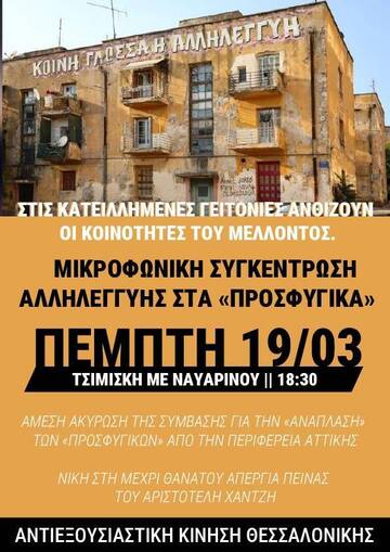 Μικροφωνική συγκέντρωση αλληλεγγύης στην Κοινότητα Κατειλλημένων Προσφυγικών την Πέμπτη 19/03 στις 18:30 Τσιμισκή με Ναυαρίνου