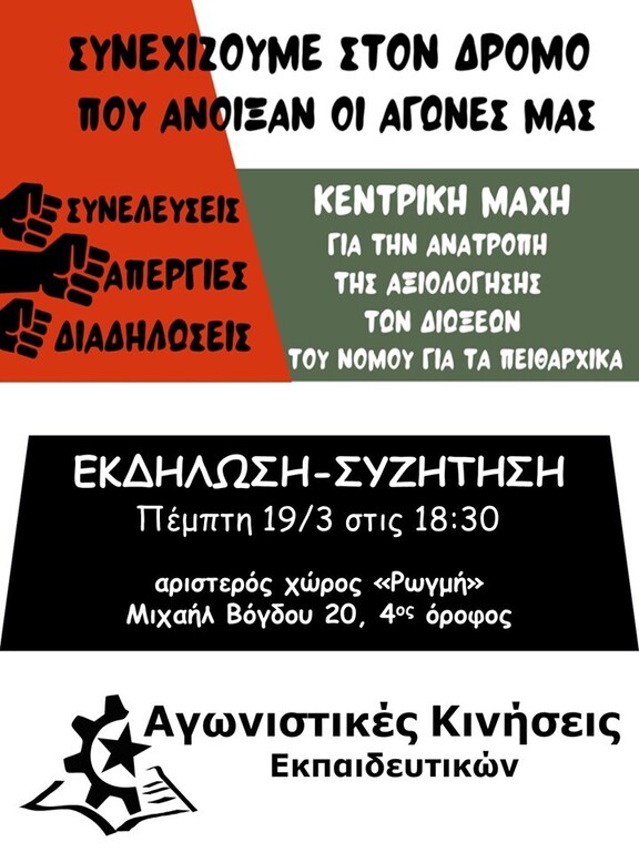 • Την Πέμπτη 19/3, στις 6:30μμ, στο στέκι Ρωγμή (Μιχ. Βόγδου 20, 4ος ορ.), σε ανοιχτή εκδήλωση για να συζητήσουμε το πώς οργανώνουμε την πάλη μας ενάντια στην αξιολόγηση, τις διώξεις και τα πειθαρχικά.