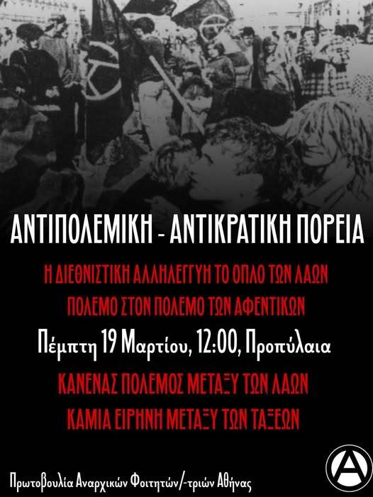 Ενάντια στον σάπιο κόσμο του Κράτους και του Καπιταλισμού που το μόνο που έχει να προσφέρει είναι και άλλους πολέμους, κι άλλο θάνατο και καταπίεση, ενάντια στον ιμπεριαλισμό και τον πόλεμο, εμείς πάντα θα στεκόμαστε στο πλάι των λαών, ποτέ με τα κράτη. Απο την Παλαιστίνη μέχρι τον Λίβανο και το Ιράν, Από την Ουκρανία μέχρι την Βενεζουέλα, το Σουδάν και τη Συρία, πάντα θα στεκόμαστε αλληλέγγυοι στους λαούς. Διότι οι λαοί δεν έχουν τίποτα να χωρίσουν μεταξύ τους, δεν έχουν κανένα συμφέρον να γίνουν κρέας στα κανόνια των ελίτ και να πεθάνουν σε έναν πόλεμο που δεν ειναι δικός τους. Γιατί ο μόνος πόλεμος που αξίζει πραγματικά να πολεμήσουμε είναι ο ταξικός, ο πόλεμος ενάντια στην καταπίεση και την εξαθλίωση, ενάντια σε αυτούς που κυβερνούν και θα κυβερνήσουν, ενάντια στα Κράτη και τις πολεμικές μηχανές τους, ο πόλεμος που μαίνεται καθημερινά, στους χώρους εργασίας, στις σχολές, στους δρόμους και τις γειτονιές μας, με όραμα την κοινωνική επανάσταση και την τελική απελευθέρωση των λαών απο τους δυνάστες τους. Ο πόλεμος για την Αναρχία και τον Ελευθεριακό Κομμουνισμό.