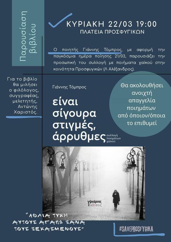 Ο ποιητής Γιάννης Τόμπρος, με αφορμή την παγκόσμια ημέρα ποίησης στις 21 Μάρτη, παρουσιάζει την Κυριακή 22 Μάρτη στην πλατεία της Κοινότητας Κατειλημμένων Προσφυγικών (Κούζη & Βεγορίτιδος), την προσωπική του συλλογή με ποιήματα χαϊκού "Είναι σίγουρα στιγμές, άρρυθμες" από τις Εκδόσεις Υψικάμινος.