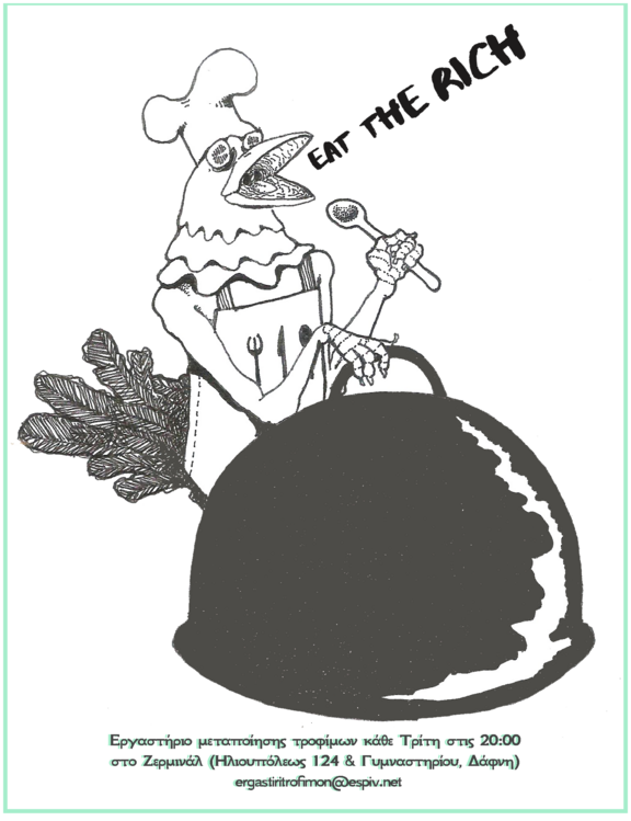 Αυτή την Τρίτη στις 19:00, ανοίγουμε το εργαστήριο μεταποίησης τροφίμων. Το εργαστήριο μεταποίησης τροφίμων φιλοδοξεί να ασχοληθεί με θέματα που σχετίζονται με την παραγωγή και μεταποίηση της τροφής, με την συλλογική κάλυψη υλικών αναγκών και επιθυμιών, με ζητήματα συνεργατικής, κοινοτικής παραγωγής και οικονομίας.