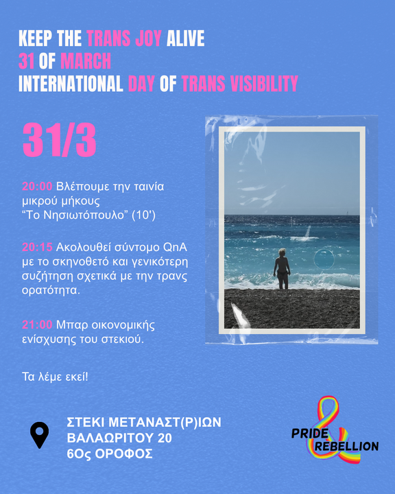 Στις 31/3 σας περιμένουμε στο στέκι μεταναστριών για να γιορτασουμε την Διεθνή Ημέρα Τρανς Ορατότητας και να να ανοίξουμε μια συζήτηση γύρω απο την τρανς χαρά!