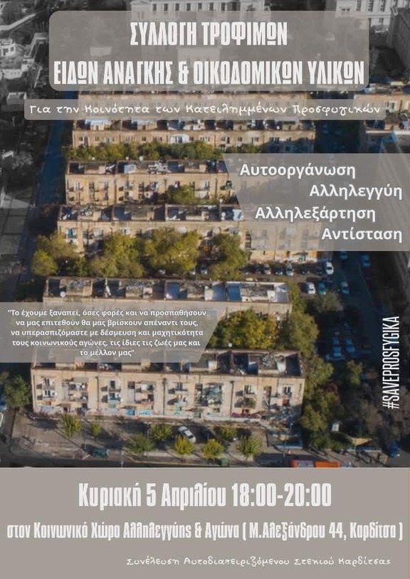 Καλούμε τον κόσμο της αλληλεγγύης σε συλλογή τροφίμων, ειδών πρώτης ανάγκης & οικοδομικών υλικών για την Κοινότητα των Κατειλημμένων Προσφυγικών στη Καρδίτσα, Κυριακή 5/4/26 από τις 18:00 μέχρι τις 20:00 στο Κοινωνικό Χώρο Αλληλεγγύης & Αγώνα ( Μ.Αλεξάνδρου 44 ).