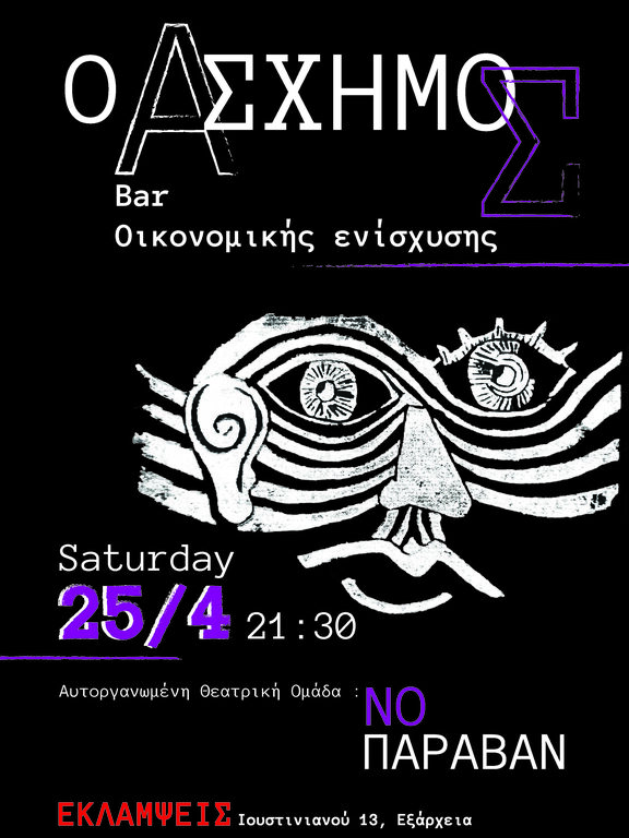 Μπαρ οικονομικής ενίσχυσης για τη θεατρική παράσταση " Ο άσχημος" της αυτοοργανωμένης θεατρικής ομάδας Νο Παραβάν αυτό το Σάββατο στις 21:30 στις Εκλάμψεις!