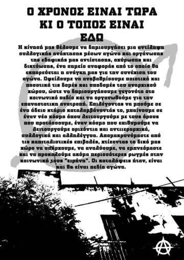 Ζώντας λοιπόν σε έναν ασφυκτικό κλοιό όπου κυριαρχεί ο νόμος και η τάξη, δομούνται αμιγώς καταναλωτικές σχέσεις, αναπαράγεται ο ατομισμός σα μονοκαλλιέργεια και η εσωτερίκευση του φόβου έχει γίνει κομμάτι της καθημερινότητας. Όφείλουμε να συλλογικοποιήσουμε τις ανάγκες μας, οπλίζοντας τις αρνήσεις μας και απελευθερώνοντας ζωτικό έδαφος. Επιλέγοντας να μπούμε σε ένα άδειο κτήριο καταλαμβάνοντάς το, μπαίνουμε σε έναν νέο κόσμο όπου λειτουργούμε με τους όρους που προτάσσουμε, έναν κόσμο που επιθυμούμε να λειτουργούμε οριζόντια και αντιιεραρχικά, συλλογικά και αλληλέγγυα. Απομακρυνόμαστε από τις καπιταλιστικές επιβολές, χτίζοντας το δικό μας χώρο να υπάρχουμε, να αναλύουμε, να εμπνεόμαστε και να προκαλούμε ακόμα περισσότερες ρωγμές στην κοινωνική τους "ειρήνη". Οι καταλήψεις ήταν, είναι και θα είναι πεδία αγώνα, είναι και θα είναι τόποι συνάντησης, ζύμωσης και συγκρότησης πολιτικής σκέψης και δράσης. Μέσα στην παγερή σιωπή της ένοπλης ειρήνης τους, οι καταλήψεις είναι ιαχές πολέμου που σπάνε τον ατέρμονο κύκλο δουλειά - αλλοτρίωση - καταναλωτισμός και θα τις υπερασπιστούμε μέχρι τέλους. Η κίνησή μας θέλουμε να δημιουργήσει μια αντίληψη συλλογικής ανάκτησης μέσων αγώνα και οργάνωσης της εδαφικής μας αντίστασης, οχύρωσης και δικτύωσης, ένα σημείο αναφοράς από το οποίο θα εκπορεύεται η ανάγκη μας για την συνέχιση του αγώνα. Οφείλουμε να αναβαθμίσουμε ποιοτικά και ποσοτικά τις δομές και υποδομές του αναρχικού χώρου, ώστε να δημιουργήσουμε γεγονότα στο κοινωνικό πεδίο και να οργανωθούμε για την επαναστατικη ανατροπή. Ένας χώρος όπου δεν διεκδικεί ή κατέχει έδαφος είναι καταδικασμένος σε έναν αργό και βασανιστικό θάνατο. Ένας χώρος ανατρεπτικός με στέκια, καταλήψεις, πλατείες, πορείες και οδοφράγματα ως σημεία αναφοράς στον πολιτικό χάρτη κατέχει άμεσα και την δυνατότητα, μικρή ή μεγάλη, της εκτροπής. Ο αγώνας των κατειλημμένων Προσφυγικών και η απεργία πείνας του συντρόφου Αρίστου, οι μαχητικές υπερασπίσεις στο Κουκάκι, στο Χημικό και τη Ντουγρού, οι ανακαταλήψεις του Ευαγγελισμού, του Άνω Κάτω και των Ζιζανίων, η κατάληψη της πρυτανείας στα Χανιά. Όλοι αυτοί οι αγώνες αποτελούν για μας πολιτικό καύσιμο, πηγή έμπνευσης και ιδεολογικής συσπείρωσης. Στέλνουμε τους χαιρετισμούς μας και στεκόμαστε αλληλέγγυα με τα συντρόφια, δε θα αφήσουμε ποτέ κανέναν μόνο στα χέρια του κράτους.