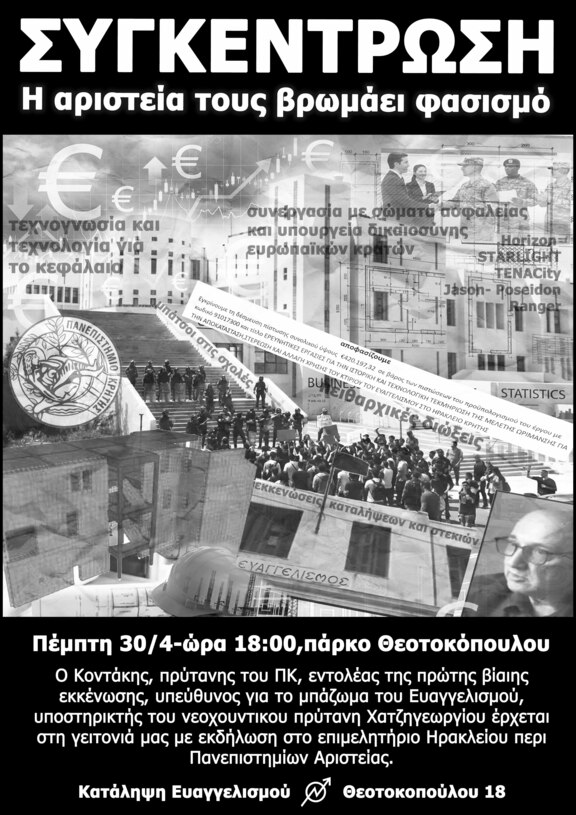 Ο Κοντάκης, πρύτανης του ΠΚ, εντολέας της πρώτης βίαιης εκκένωσης, υπεύθυνος για το μπάζωμα του Ευαγγελισμού, υποστηρικτής του νεοχουντικου πρύτανη Χατζηγεωργίου έρχεται στη γειτονιά μας με εκδήλωση στο επιμελητήριο Ηρακλείου περι Πανεπιστημίων Αριστείας.