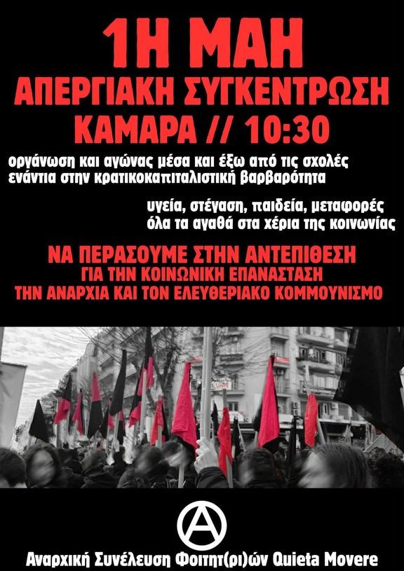Η ημέρα της πρωτομαγιάς δεν αποτελεί μία ημέρα αργίας, λόγω της θεσμικής της κατοχύρωσης αλλά στην σημερινή κατάσταση κατά την οποία η εργατική τάξη έχει βιώσει το ξεχαρβάλωμα πληθώρας δικαιωμάτων και με το βιωτικό της επίπεδο να είναι διαρκώς μειούμενο,βρίσκει το νόημά της ως ημέρα μάχης και αγώνα. Ενός αγώνα που θα σταθεί εμπόδιο στην ζωή λάστιχο και γαλέρα που επιδιώκουν κράτος και αφεντικά να μας καταδικάσουν, της ζωής με τις εργατικές δολοφονίες στα κάτεργα της μισθωτής εργασίας να είναι καθημερινότητα,της ζωής με πενιχρούς μισθούς και της ζωής διαρκούς "stand-by" δίχως ωράρια με τον/την εργαζόμενο/η να μετατρέπεται σε "λάστιχο" για τις ανάγκες της καπιταλιστικής κερδοφορίας.
