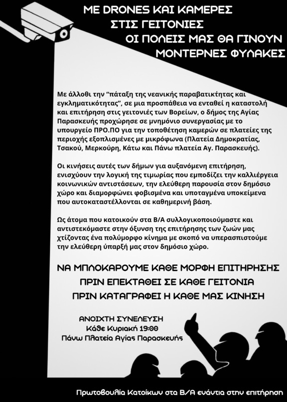Η κίνηση του δημάρχου Αγ. Παρασκευής να εξοπλίσει τον δήμο μας με drone είχε αρχικά καταγγελθεί αντανακλαστικά από τους δημότες, κάνοντας έτσι εμφανή την έλλειψη νομιμοποίησής της. Στη συνέχεια άρχισε ένας κύκλος ανοιχτών συζητήσεων από κατοίκους και συλλογικότητες των βορειοανατολικών, από τον οποίο προέκυψε η Πρωτοβουλία κατοίκων στα Β/Α ενάντια στην επιτήρηση. Ως άτομα που κατοικούν στα Β/Α, συλλογικοποιούμαστε και αντιστεκόμαστε στην όξυνση της επιτήρησης των ζωών μας, χτίζοντας ένα πολύμορφο κίνημα που μέσα από οριζόντιες διαδικασίες, παρεμβαίνει στη γειτονιά (με μικροφωνικές, αφισοκολλήσεις, μοιράσματα, παρεμβάσεις στο δημοτικό συμβούλιο και πορείες) με σκοπό να υπερασπιστούμε την ελεύθερη ύπαρξη μας στον δημόσιο χώρο.