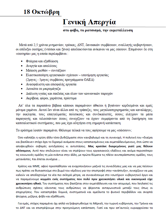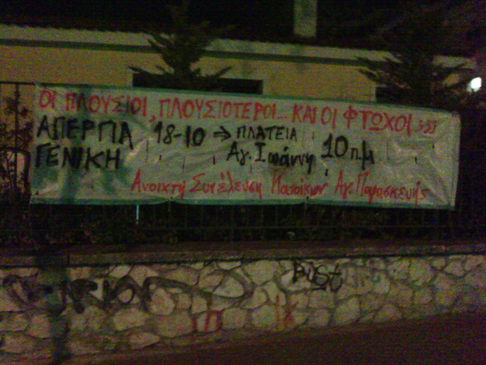 Στις 10 π.μ. απεργιακή προσυγκέντρωση στην πλατεία Αγ. Ιωάννου και συμμετοχή στην απεργιακή πορεία στο Μουσείο (Πατησίων & Στουρνάρη), ώρα 11 πμ, με το κοινό μπλόκ των συνελεύσεων γειτονιων