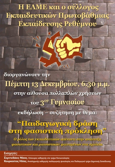 Εκδήλωση/συζήτηση της ΕΛΜΕ και του συλλόγου εκπαιδευτικών Πρωτοβάθμιας Εκπαίδευσης Ρεθύμνου με θέμα «παιδαγωγική δράση στη φασιστική πρόκληση» Ο ρόλος των εκπαιδευτικών απέναντι στην αναπτυξη φασιστικών και ρατσιστικών φαινομένων στα σχολεία.