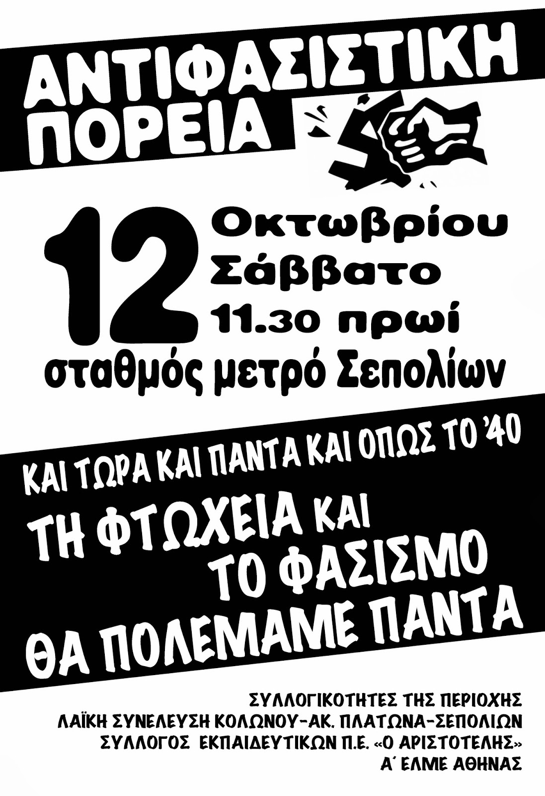 ΑΝΤΙΦΑΣΙΣΤΙΚΗ ΠΟΡΕΙΑ ΤΟ ΣΑΒΒΑΤΟ 12 ΟΚΤΩΒΡΙΟΥ ΣΤΟ ΜΕΤΡΟ ΤΩΝ ΣΕΠΟΛΙΩΝ