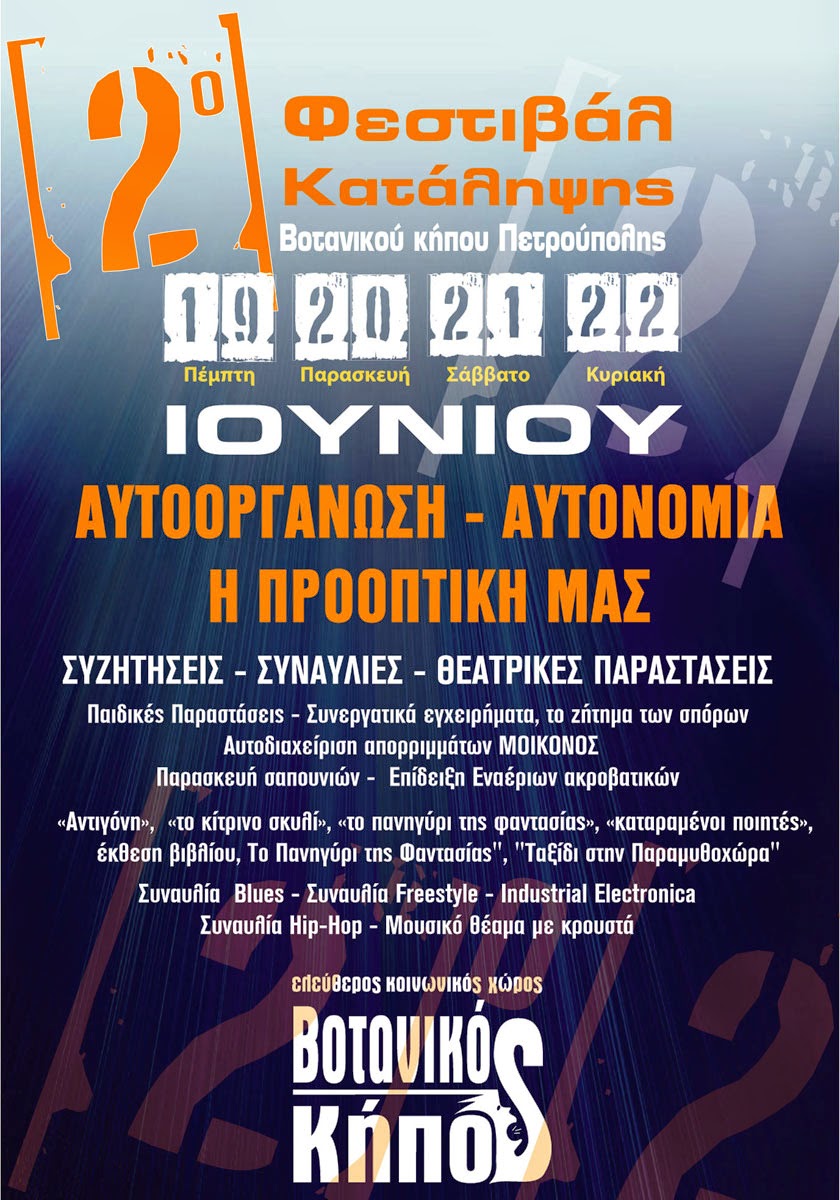 Στην κατάληψη του Ελεύθερου Κοινωνικού Χώρου "Βοτανικός Κήπος" Πετρούπολης διοργανώνουμε για 2η χρονιά από τις 19 έως τις 22 Ιουνίου 2014 το Φεστιβάλ των ομάδων μας.