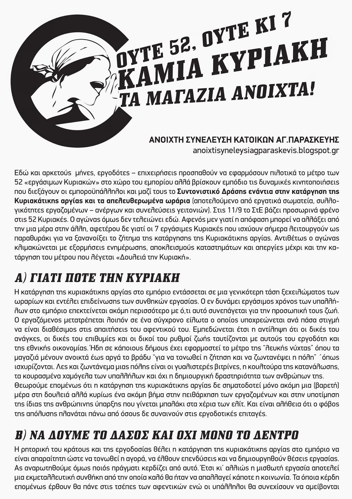 Ανακοίνωση του Συντονιστικού δράσης ενάντια στην κατάργηση της Κυριακάτικης αργίας και τα "απελευθερωμένα" ωράρια για την πανελλαδική απεργία την Κυριακή 2 Νοέμβρη στο εμπόριο [απεργιακή συγκέντρωση: 11πμ, Ερμού & Κορνάρου]