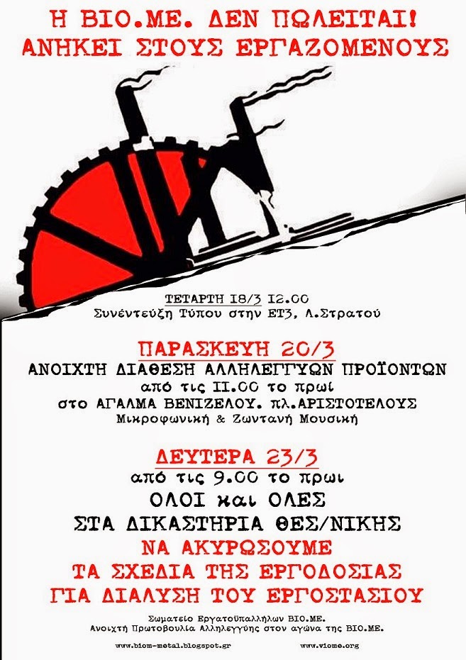 Στηρίζουμε τον αγώνα των εργαζομένων της Βιο.Με. και είμαστε ενάντια σε οποιαδήποτε ενέργεια θέλει να πλήξει το εγχείρημα, ξεπουλώντας το εργοστάσιο που τόσο καιρό οι εργαζόμενοι κρατάνε ζωντανό. Δηλώνουμε την αλληλεγγύη μας για να νικήσει η αυτοδιαχείριση.
