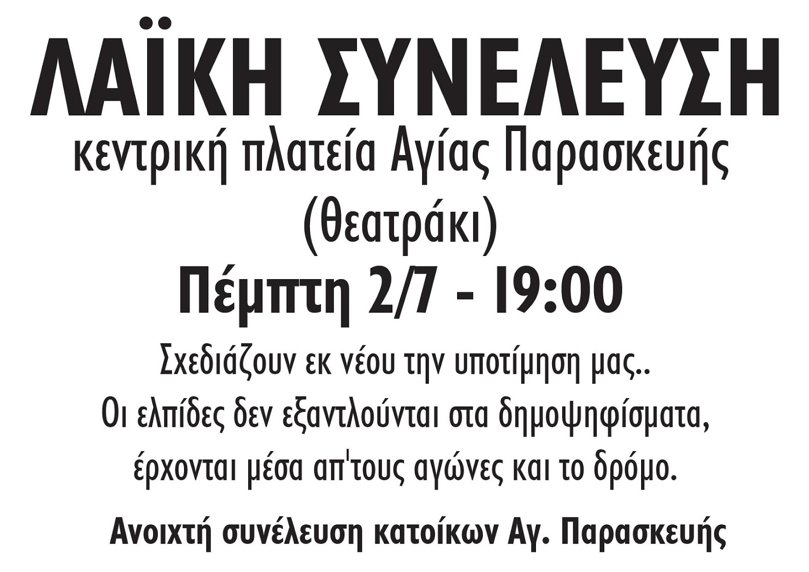 τι; : συνέλευση θεματική : οργάνωση από : Ανοιχτή συνέλευση κατοίκων Αγίας Παρασκευής