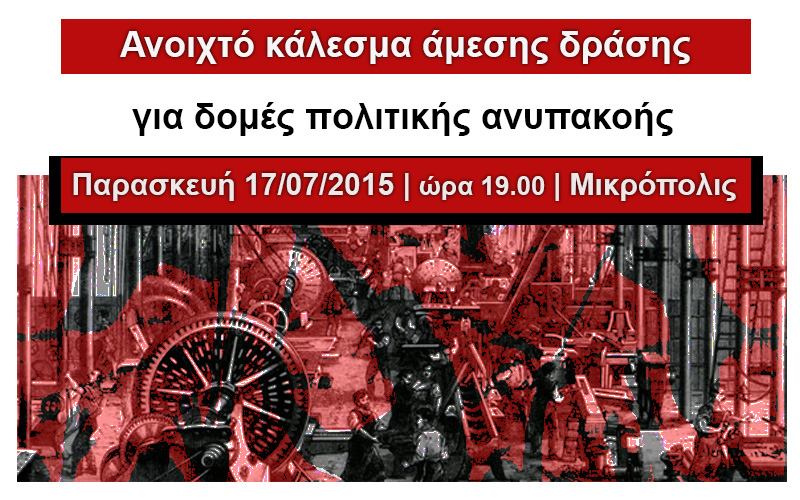 Η συνάντηση της ομάδας εργασίας ορίστηκε για την Παρασκευή 17/7/2015, στις 19.00, με περιεχόμενο συγκεκριμένες προτάσεις άμεσων δράσεων πολιτικής ανυπακοής και δομικής ανατροπής του οικονομικού ολοκληρωτισμού και της πολιτικής ανάθεσης ενάντια στη λεηλασία της ζωής μας.
