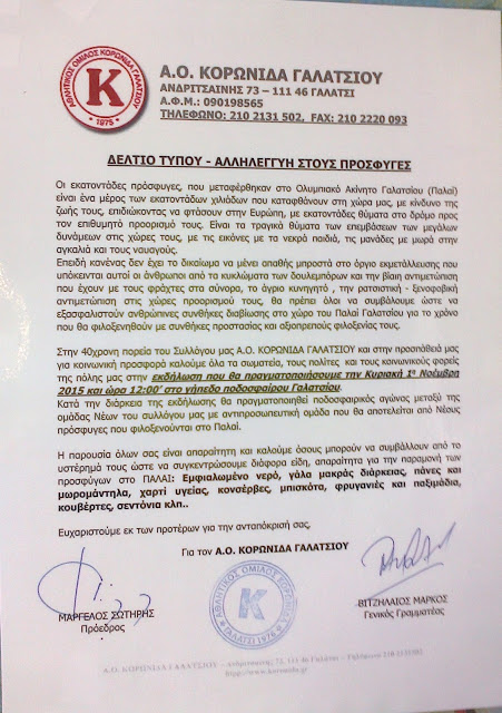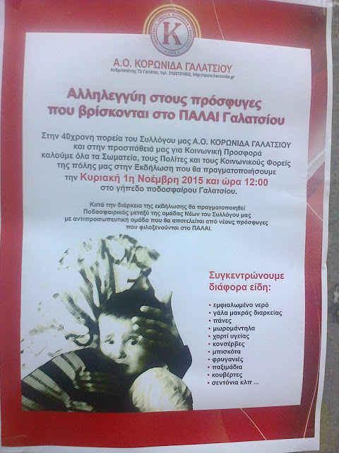 Συνεχίζοντας η Κορωνίδα επισημαίνει: «Στη 40χρονη πορεία του Συλλόγου μας Α.Ο. Κορωνίδα Γαλατσίου και στην προσπάθειά μας για κοινωνική προσφορά, καλούμε όλα τα σωματεία, τους πολίτες και τους κοινωνικούς φορείς της πόλης μας στην εκδήλωση που θα πραγματοποιήσουμε την Κυριακή 1η Νοέμβρη 2015 και ώρα 12:00 στο γήπεδο ποδοσφαίρου Γαλατσίου.