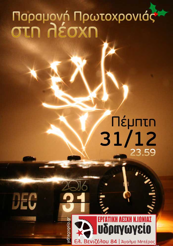 Σας προσκαλούμε να γιορτάσουμε παρέα την αλλαγή του χρόνου στην Εργατική Λέσχη Νέας Ιωνίας με μουσική, ποτά, φαγητό και κουβεντούλα. Για να ευχηθούμε και να γιορτάσουμε ένα αγωνιστικό και ανατρεπτικό 2016!