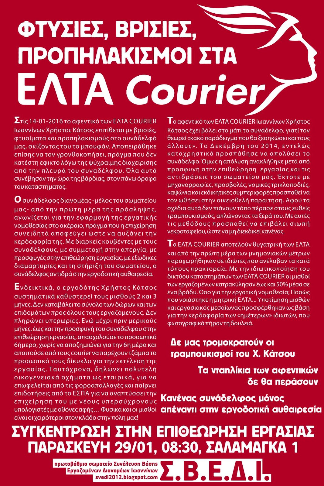 Το σωματείο μας καλεί σε συγκέντρωση έξω από την Επιθεώρηση Εργασίας (Σαλαμάγκα 1, Ιωάννινα) την Παρασκευή 29/01/2016, στις 08:30, την ώρα που θα πραγματοποιηθεί η εργατική διαφορά του συναδέλφου κατά του αφεντικού των ΕΛΤΑ Courier Ιωαννίνων, σχετικά με το περιστατικό προπηλακισμού που έλαβε χώρα στις 14/01/2016. Για το λόγο αυτό τυπώθηκε αφίσα που κολλιέται μαζικά στην πόλη.