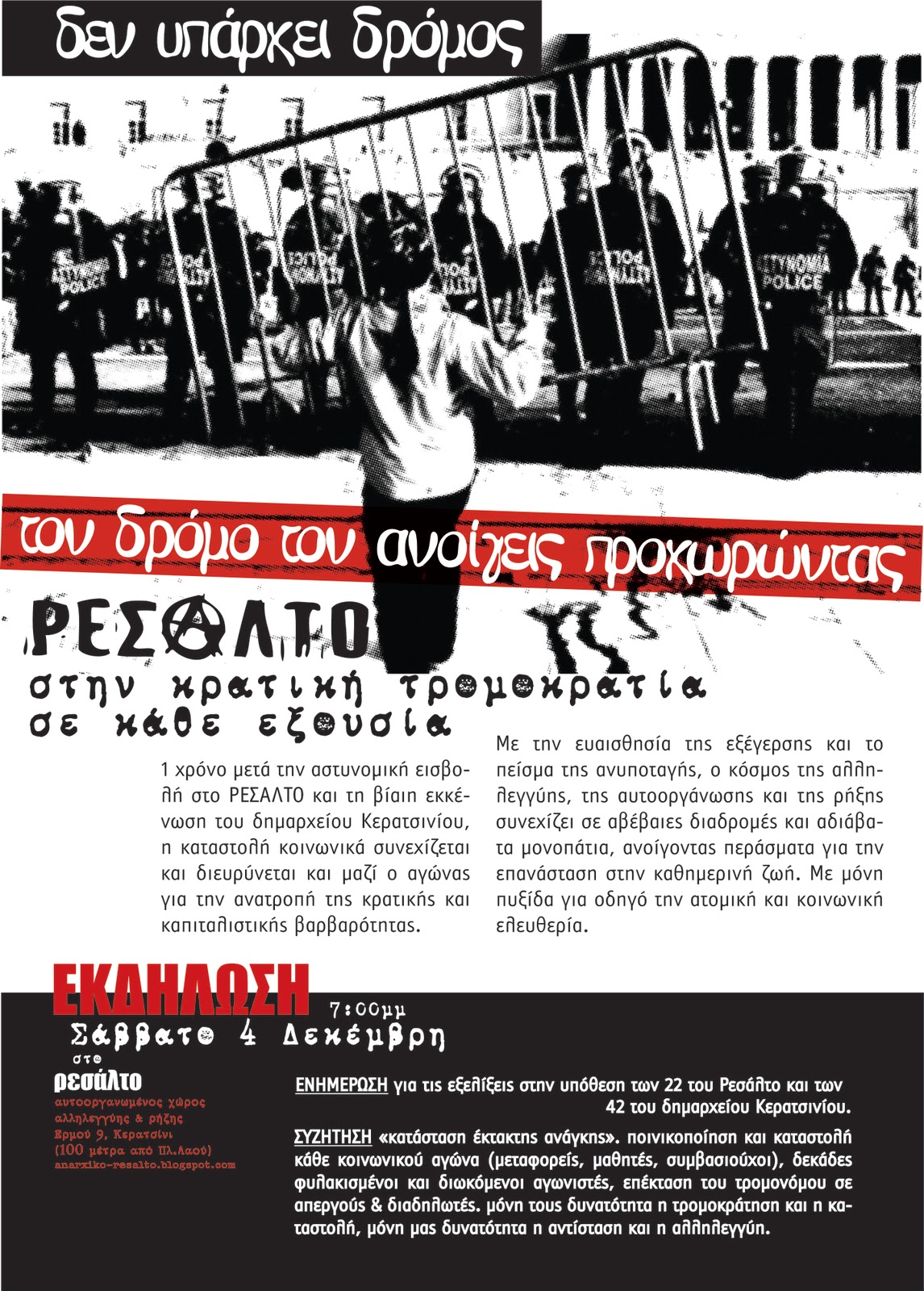 1 χρόνο μετά την αστυνομική εισβολή στο ΡΕΣΑΛΤΟ και τη βίαιη εκκένωση του δημαρχείου Κερατσινίου, η καταστολή κοινωνικά συνεχίζεται και μαζί ο αγώνας για την ανατροπή της κρατικής και καπιταλιστικής βαρβαρότητας.
