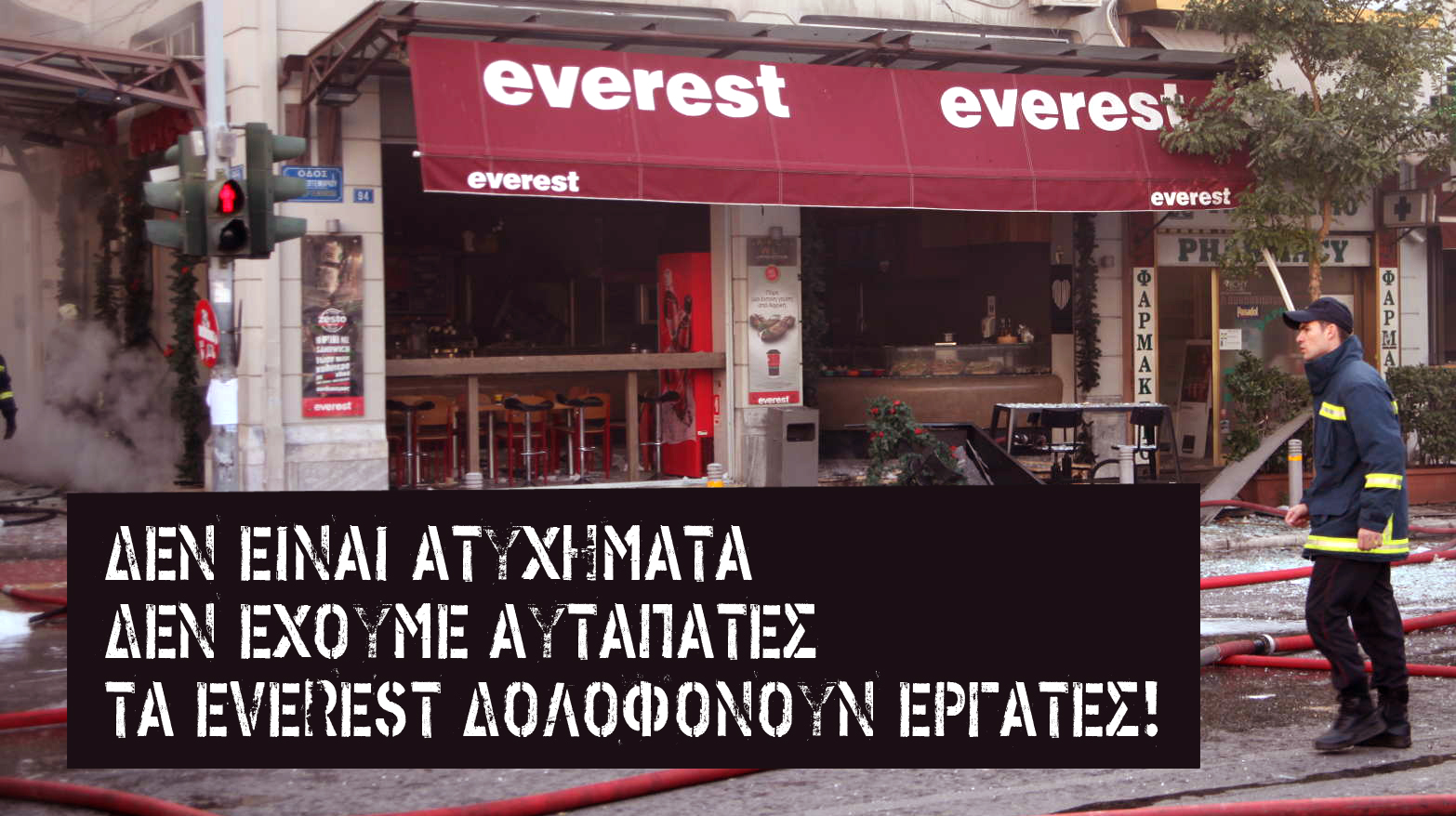 Την Πέμπτη 1/12/16 λίγο μετά τις 9 το πρωί σημειώθηκε έκρηξη στο κατάστημα EVERESTπου βρίσκεται στην πλατεία Βικτωρίας. Αποτέλεσμα αυτού ο θάνατος της λογίστριας της επιχείρησης και ο τραυματισμός ακόμα 3 εργαζομένων και 2 πολιτών. Η εργαζόμενη εγκλωβίστηκε στο γραφείο που δούλευε, το οποίο η εταιρία, προκείμενου να γλιτώσει χώρο και χρήμα, είχε τοποθετήσει στον υπόγειο χώρο δίπλα από την κουζίνα του καταστήματος όπου εκείνη την ώρα γίνονταν εργασίες συντήρησης χωρίς η εταιρία να έχει φροντίσει για τα απαραίτητα μέτρα ασφαλείας.